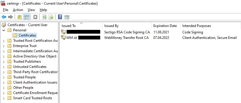 Список персональных сертификатов пользователя в хранилище сертификатов Windows можно посмотреть с помощью менеджера сертификатов (certmgr.msc). А как получить этот список в своей программе?