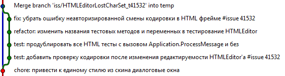При этом мы придерживаемся правила — код должен документировать сам себя. Комментарий в коде — признак плохого кода. Цель описания в коммите — не описание изменений, а описание почему именно так, а не иначе. В тексте коммита можно описать альтернативные варианты решения с плюсами и минусами. К слову сказать, текст коммита у нас так же ревьювируется как и код. В SVN это правило было тяжело соблюдать. Как правило, задача уходила на сервер одним коммитом, что бы не получить в централизованном репозитории не консистентного состояния. Описание всех изменений в одном коммите теряет свою красоту и эффективность. В git’е каждую задачу можно декомпозировать до небольших логических шагов, о чем в следующем правиле. |